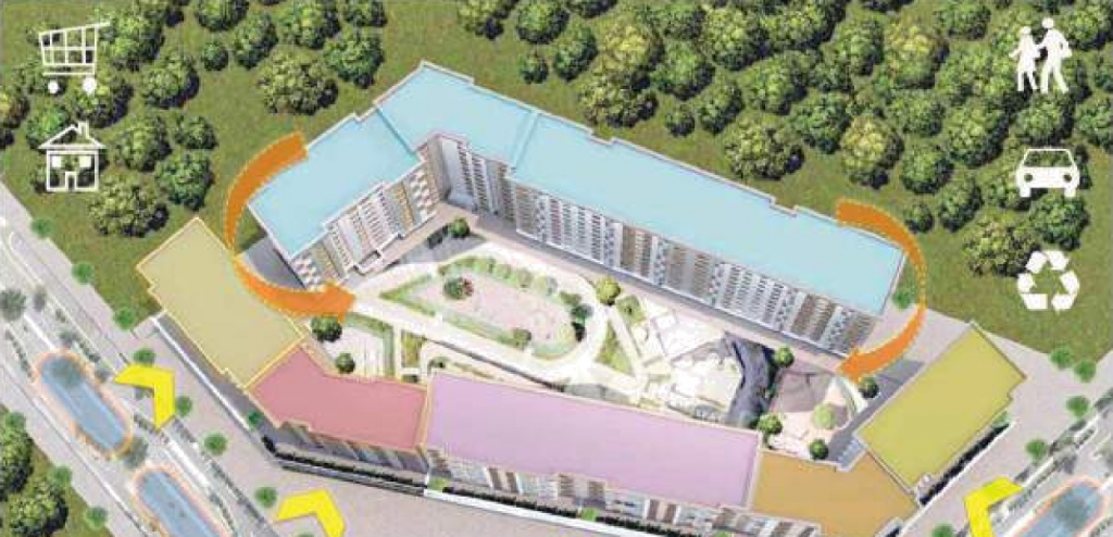 Elle se compose de neuf immeubles avec des locaux commerciaux au rez-de-chaussée, des places de parking et des celliers au sous-sol.